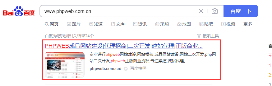 网站首页收录,即这个网站首页主域名被收录了。举例网站建设(http://www.phpweb.com.cn)查看方式,直接把域名放百度里即可: